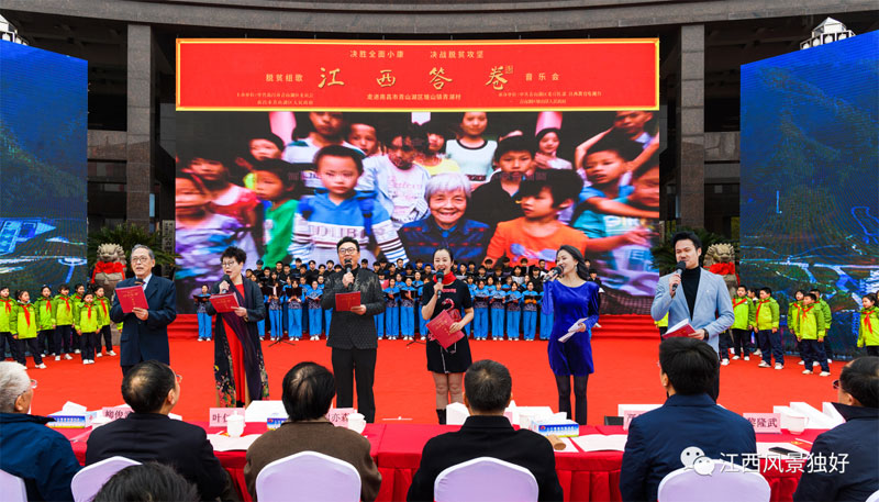 江西是革命老區(qū),曾經(jīng)為中國(guó)革命做出過(guò)巨大犧牲和巨大貢獻(xiàn)。江西也是全國(guó)脫貧攻堅(jiān)主戰(zhàn)場(chǎng)之一。全省25個(gè)貧困縣都是重點(diǎn)老區(qū)縣,大部分處于贛南等原中央蘇區(qū)。其中,24個(gè)為國(guó)定貧困縣,1個(gè)為省定貧困縣。2020年4月26日,江西省政府召開(kāi)新聞發(fā)布會(huì),正式宣布于都縣、興國(guó)縣、寧都縣、贛縣區(qū)、鄱陽(yáng)縣、修水縣、都昌縣7個(gè)貧困縣(區(qū))脫貧退出,這是我省第四批次貧困縣脫貧退出。至此,全省25個(gè)貧困縣全部脫貧退出,意味著歷史性解決江西老區(qū)群眾絕對(duì)貧困問(wèn)題,這是我省扶貧開(kāi)發(fā)史上具有里程碑意義的重大事件。對(duì)此,開(kāi)場(chǎng)曲《老表的掌聲響起來(lái)》生動(dòng)表達(dá)了老區(qū)群眾的激動(dòng)與祝福:“老表的掌聲響起來(lái),映山紅花兒在盛開(kāi)。脫貧宣言暖民心,決勝小康大步邁!老表的掌聲響起來(lái),千萬(wàn)顆心兒在期待。鄉(xiāng)村振興奏凱歌,美好生活樂(lè)開(kāi)懷……老表的掌聲響起來(lái)!江西好運(yùn)當(dāng)頭,老表幸福常在!”
