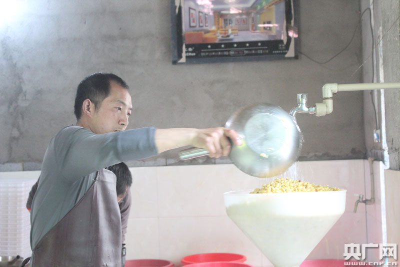 4月28日,羅王清在自己豆腐坊里打豆子制作豆?jié){