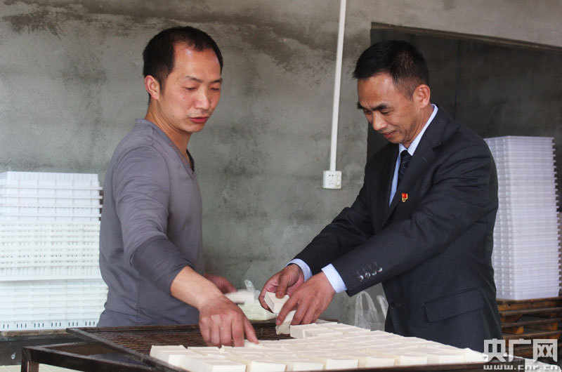 4月28日,農(nóng)行修水支行客戶經(jīng)理冷學(xué)東上門了解今年的羅王清今年豆腐生產(chǎn)情況,幫助制作醬干豆腐