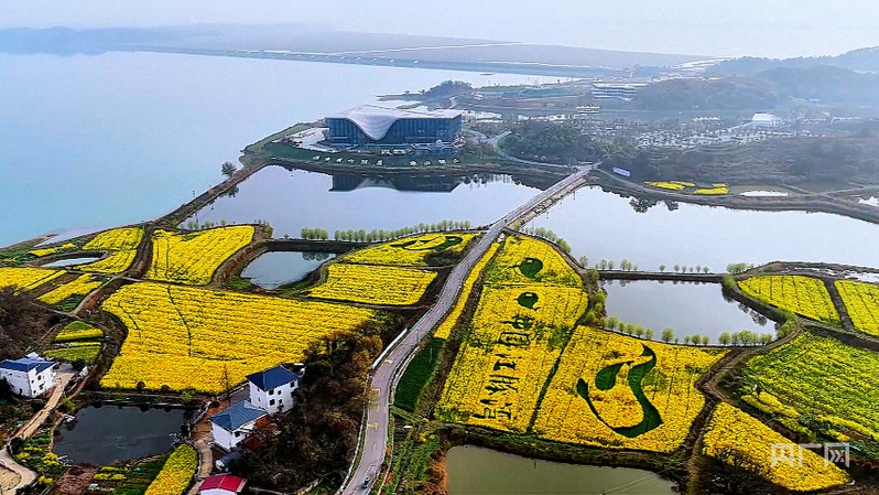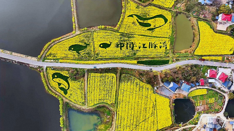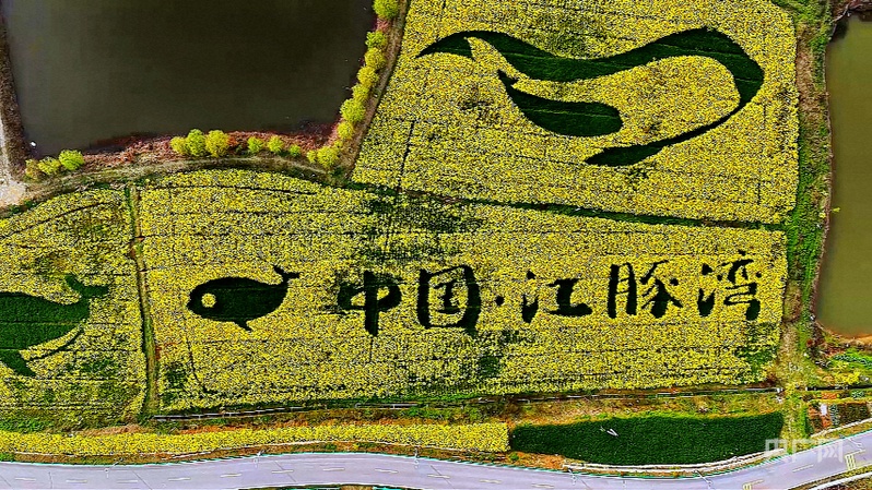 放眼望去,盛放的油菜花宛如一張巨幅金色地毯,在大地上鋪陳開來。花海中,以江豚為造型的綠色花雕與“中國·江豚灣”字樣格外醒目,與流動的金色花浪形成靈動對比,既彰顯了地域特色,又傳遞出濃厚的生態(tài)文化意蘊。