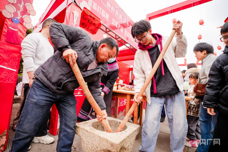 游客體驗打糍粑(央廣網(wǎng)發(fā) 肖江峰 攝)