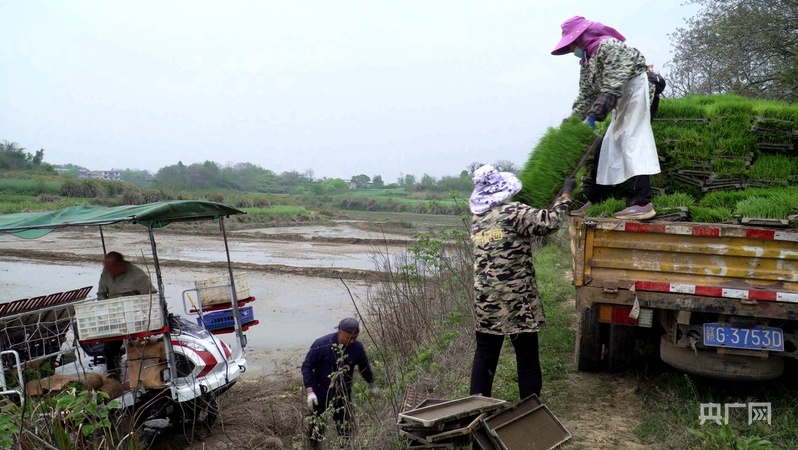 與此同時(shí),在彭澤縣楊梓鎮(zhèn)雙豐村的高標(biāo)準(zhǔn)農(nóng)田,連片水田波光粼粼,高速插秧機(jī)往來穿梭,農(nóng)戶們搶抓晴好天氣,全力推進(jìn)水稻移栽作業(yè),田間地頭處處是繁忙有序的農(nóng)耕景象,規(guī);(jīng)營和機(jī)械化應(yīng)用成為當(dāng)下春耕生產(chǎn)的主旋律。在種植大戶蘭賽華的育秧大棚里,工人們正有序取運(yùn)秧苗。彭澤縣楊梓鎮(zhèn)雙豐村種植大戶蘭賽華說,“這段時(shí)間農(nóng)忙,找了村里30多個(gè)村民來幫忙,既能加快移栽進(jìn)度,也能讓鄉(xiāng)親們在家門口掙到錢!