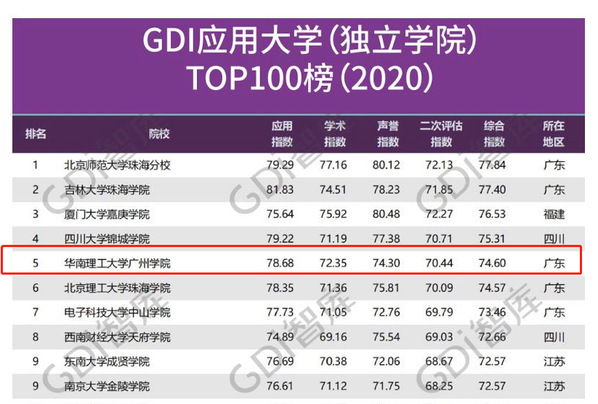 GDI智庫應(yīng)用大學(xué)排行榜獨創(chuàng)性地將公辦普通本科院校、獨立學(xué)院和民辦院校共計910所本科高校在同一個體系下進行評價,通過對各高校的應(yīng)用指數(shù)、學(xué)術(shù)指數(shù)、聲譽指數(shù)和二次評估指數(shù)進行科學(xué)評價,得到綜合指數(shù),根據(jù)綜合指數(shù)確定榜單排名,打造應(yīng)用大學(xué)新型評價體系。值得一提的是,在“GDI應(yīng)用大學(xué)(獨立學(xué)院)TOP100榜”中,華南理工大學(xué)廣州學(xué)院位列全國第五。其中,應(yīng)用指數(shù)和學(xué)術(shù)指數(shù)排名學(xué)校位列全國第四,標(biāo)志著華南理工大學(xué)廣州學(xué)院在辦學(xué)層次和辦學(xué)水平上又有了新的飛躍。