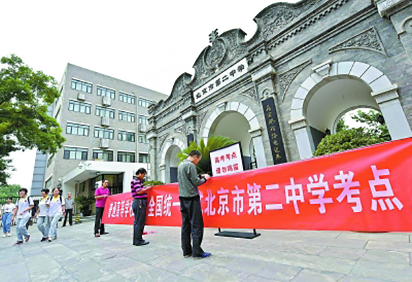 昨天,北京二中考點(diǎn)外,工作人員正在懸掛考點(diǎn)橫幅。和冠欣 攝