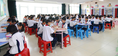 書香彌漫的閱覽室 在打造英語辦學(xué)特色的同時,學(xué)校積極創(chuàng)建“人文、書香、健康”校園。“人文校園”以創(chuàng)建充滿人文關(guān)懷的校園環(huán)境來熏陶學(xué)生,以課堂教學(xué)中滲透人文精神來感召學(xué)生,使校園環(huán)境與師生之間充滿和諧美;“書香校園”以營造濃郁的讀書氛圍點燃師生的讀書激情,促使師生以讀書為樂,養(yǎng)成終身閱讀的習(xí)慣;“健康校園”關(guān)注師生的身體健康和心理健康,組織師生進(jìn)行體育鍛煉,開展心理咨詢,讓師生“健康生活每一天”。