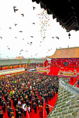 現場鳴禮炮三十四響,代表中國三十四個省、市、自治區(qū)、特別行政區(qū);擊鼓撞鐘各九響,象征中華民族傳統(tǒng)中的最高禮數。之后代表們向太昊伏羲氏敬獻了花籃并獻香、獻爵。隨后,全體參拜人員滿懷對人文始祖太昊伏羲氏的景仰鞠躬,行施拜禮!