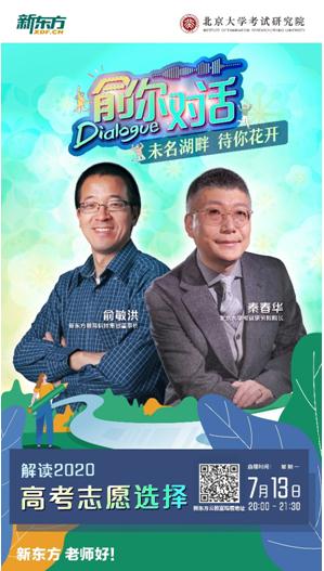 為了幫助考生科學(xué)填報(bào)志愿,合理規(guī)劃未來,7月13日20:00,新東方創(chuàng)始人俞敏洪將直播對話北京大學(xué)考試研究院院長秦春華,共同解讀2020高考志愿選擇,并為即將踏入大學(xué)校門的大一新生帶來學(xué)習(xí)規(guī)劃、人生發(fā)展、方向選擇等全方面的成長干貨。