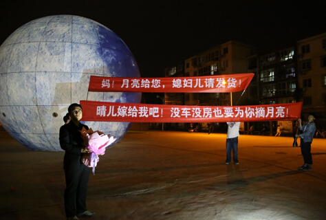 “我說(shuō)這小伙子不錯(cuò),這么大個(gè)的月亮怎么運(yùn)來(lái)的?”“這丈母娘也夠?yàn)殡y人,往哪摘月亮去,小伙子夠能整的。”“買這么個(gè)東西不便宜吧,真沒(méi)車沒(méi)房?”在大媽們的討論聲中,女主角晴兒低頭接過(guò)花,兩人擁抱在一起,現(xiàn)場(chǎng)又一片歡騰。