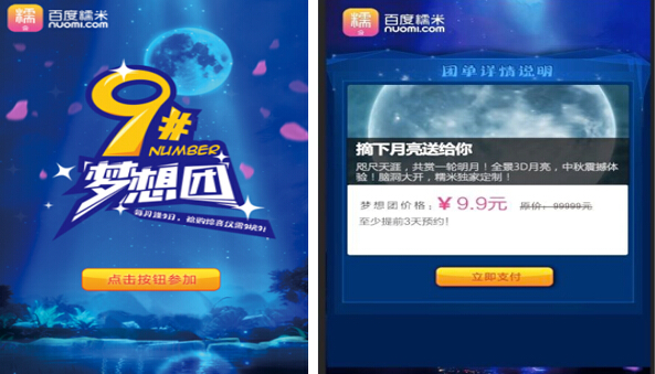 “真挺感謝糯米的,那么多工作人員陪著我忙活了半天才搭起來(lái),還給我求婚出主意,而且這個(gè)月亮我真是太需要了!庇砾i參加的“9號(hào)夢(mèng)想團(tuán)”是百度糯米推出的一種創(chuàng)意團(tuán)單,用戶用很低的價(jià)格下單“做夢(mèng)的權(quán)利”,幸運(yùn)和驚喜就可能突然出現(xiàn)。繼90后小鵬以9.9元搶到了“北海上的皇家七夕宴”之后,永鵬是又一位幸運(yùn)用戶。