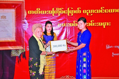 近日中國(guó)緬甸語(yǔ)言專家粟秀玉通過(guò)“粟秀玉教授基金”向107名緬甸貧困大學(xué)生捐贈(zèng)助學(xué)金儀式在中國(guó)駐緬大使館舉行。與會(huì)嘉賓對(duì)其善舉給予高度贊揚(yáng),祝愿中緬友誼萬(wàn)古長(zhǎng)青。圖為粟秀玉教授(左)向?qū)W生代表發(fā)放助學(xué)金。(本報(bào)駐仰光記者 湯先營(yíng)攝)