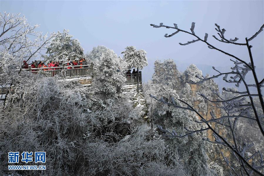 3月10日,游客在雪后的湖南張家界武陵源景區(qū)游覽。當日10時,中央氣象臺繼續(xù)發(fā)布寒潮藍色預警。受寒潮影響,浙江、江西、湖北、湖南、貴州等多地出現(xiàn)明顯大風降溫和雨雪天氣。新華社發(fā)(吳勇兵 攝)