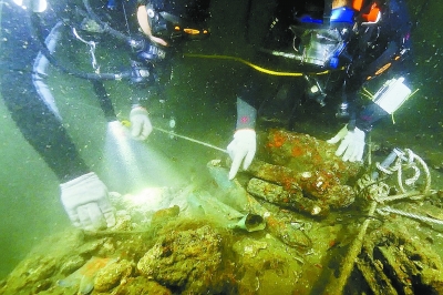 “丹東一號(hào)”考古人員在水下工作(2015年10月5日攝)。
