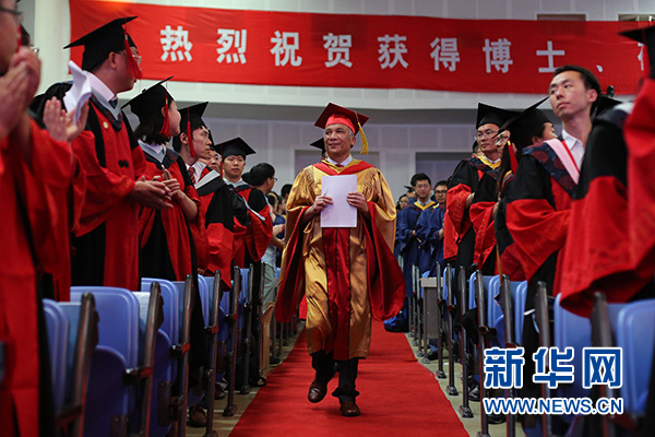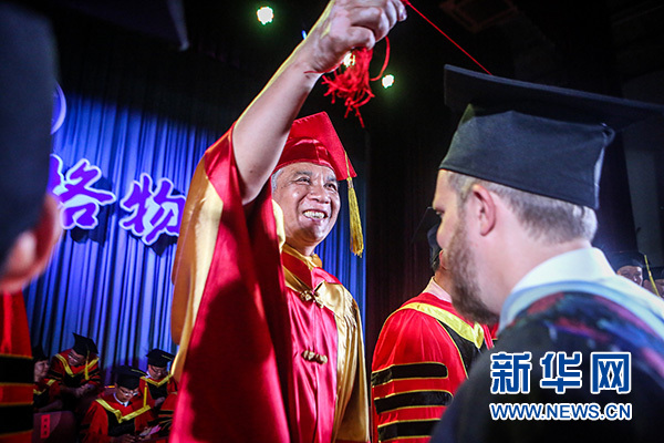國科大2016年度學位授予儀式上丁仲禮校長為畢業(yè)生扶正流蘇。