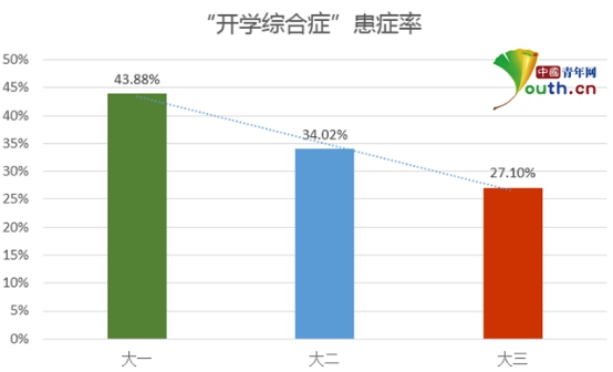 圖為從大一至大三“開學(xué)綜合癥”患癥率柱狀圖。中國(guó)青年網(wǎng)記者 王龍龍 制圖