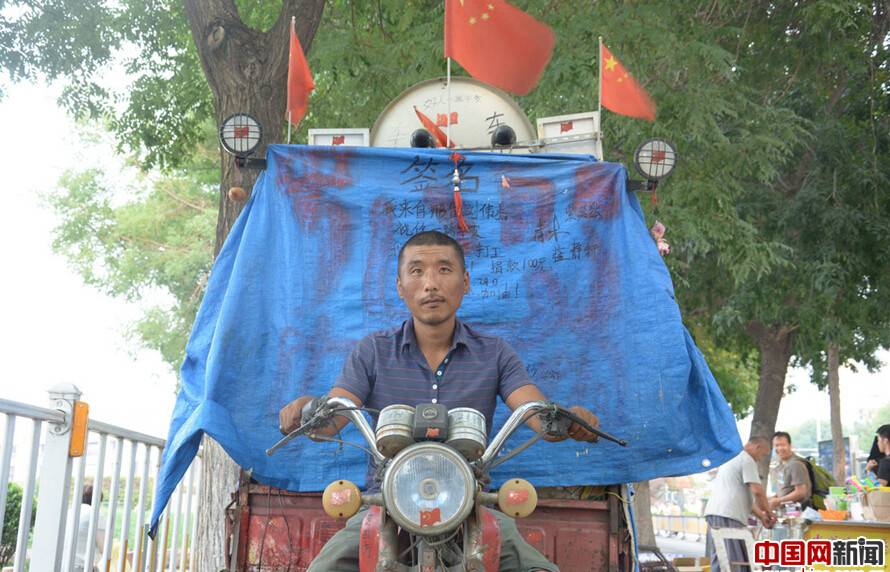 山東濟南市,一輛經(jīng)過改裝的摩托三輪車停在街頭,車頂上安裝了太陽能,既能看電視又能做飯。經(jīng)過了解,小伙名叫金東賀,今年36歲,2016年5月18日從吉林延邊出發(fā),途徑遼寧、天津、北京、河北,來到山東,行程近3400公里,計劃用三年半的時間走遍全中國。金東賀出發(fā)的時候就帶了幾十元錢,一路靠撿廢舊飲料瓶換取旅途費用。改裝這輛車的費用不到2000元,安了太陽能,配了電視和音響,還養(yǎng)了兩只狗和自己做伴。