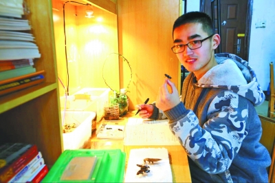 趙宇晨打小就對(duì)昆蟲(chóng)特別感興趣,初中時(shí),他就常常捉昆蟲(chóng)悄悄帶回家“圈養(yǎng)”,以方便觀察它們的生長(zhǎng)過(guò)程。由于忌憚父母,只能“偷偷摸摸”,后來(lái)上了高中,學(xué)業(yè)任務(wù)重,也就“有賊心沒(méi)賊膽”。正是因?yàn)閷?duì)昆蟲(chóng)強(qiáng)烈的熱愛(ài),他選擇了生物專(zhuān)業(yè)。