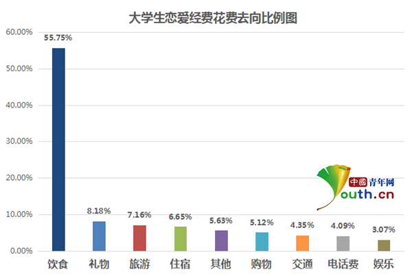在戀愛消費中,什么占最大比例呢?“買吃的是最主要的消費吧!毙锣l(xiāng)學院的王鵬飛在回答中國青年網(wǎng)記者提問時表示,剛戀愛一個月,為了買好吃的已經(jīng)花掉了自己和女朋友1600元。根據(jù)中國青年網(wǎng)調(diào)查,55.75%的大學生認為在戀愛消費中“飲食花銷最大”。