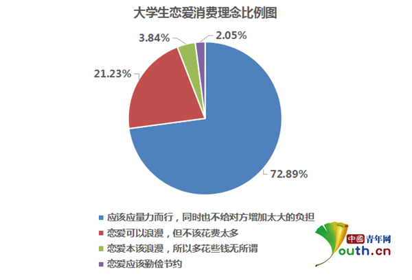 根據(jù)中國青年網(wǎng)調(diào)查數(shù)據(jù)顯示,在戀愛消費理念方面,有72.89%的學生認為雙方“應該量力而行,同時也不給對方增加太大的負擔”,其次為“戀愛可以浪漫,但不該花費太多”占21.23%,僅有3.84%的學生認為“戀愛本該浪漫,所以多花些錢無所謂”。由此可見,大學生戀愛消費理念相對理性。