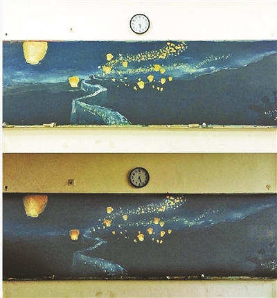 走進(jìn)福州一中高二(13)班,你一定會(huì)被教室后方墻壁上的黑板報(bào)吸引。黑板上是一幅水粉畫,畫的是夜里的長(zhǎng)城,冉冉升起漫天孔明燈。有趣的是,即使拉上窗簾、關(guān)上燈,黑板上的畫仍能看見,似乎孔明燈里真的燃著火光。