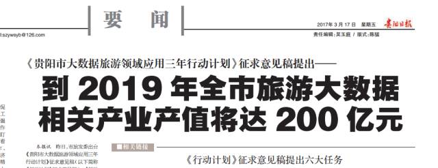 2017年3月16日,貴陽(yáng)市旅發(fā)委出臺(tái)《貴陽(yáng)市大數(shù)據(jù)旅游領(lǐng)域應(yīng)用三年行動(dòng)計(jì)劃》征求意見稿。征求意見稿提出,創(chuàng)新旅游行業(yè)管理和旅游公共服務(wù)模式,到2019年,全市打造智慧旅游示范企業(yè)3至5個(gè),引進(jìn)和培育大數(shù)據(jù)旅游企業(yè)5至10家,旅游大數(shù)據(jù)相關(guān)產(chǎn)業(yè)產(chǎn)值將達(dá)200億元,旅游業(yè)態(tài)逐步向綜合性、融合性轉(zhuǎn)型。