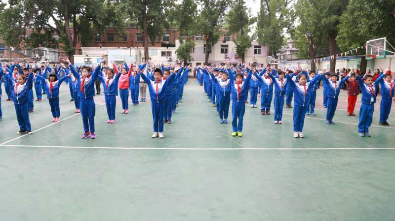 課間操展示活動中,主要由學生展示國家規(guī)定的《希望風帆》、《七彩陽光》兩套廣播體操和師生自主編創(chuàng)的《健康歌》、《水果拳》兩套課間操。