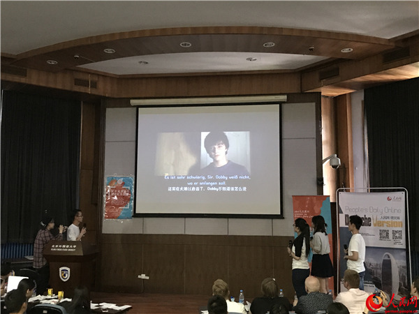 人民網(wǎng)北京5月8日電(王曉玎)6日下午,2017“人民網(wǎng)杯”京津地區(qū)高校德語配音大賽在北京外國(guó)語大學(xué)舉辦。此次大賽吸引了來自北京大學(xué)、中國(guó)人民大學(xué)、北京外國(guó)語大學(xué)、北京第二外國(guó)語學(xué)院、中國(guó)傳媒大學(xué)、南開大學(xué)等12所知名院校的代表隊(duì)參加。
