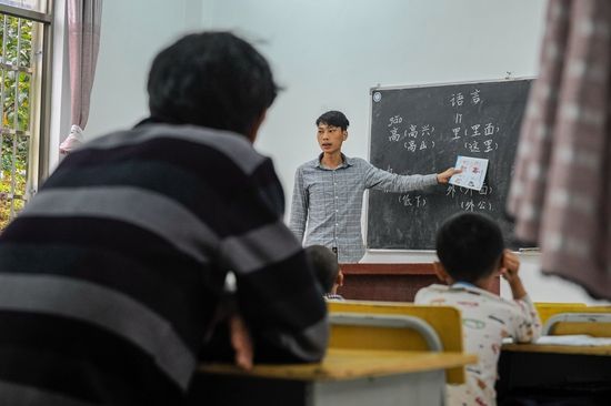 “咬著牙齒,送氣,呲……”從拼音的聲母、韻母,到發(fā)音技巧,吳志平教得細(xì)。他會(huì)耐心地糾正學(xué)生的發(fā)音,帶著他們反復(fù)朗讀。得益于自己掌握普通話和苗語(yǔ),他不時(shí)用“雙語(yǔ)教學(xué)”來(lái)提高課堂效率,“先用苗語(yǔ)講,然后逐字翻譯成普通話,帶孩子們反復(fù)練習(xí),這是父親教我的方法!