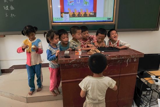 4月11日,大華寮村教學(xué)點(diǎn),學(xué)生們圍觀上課用的電腦。這是該教學(xué)點(diǎn)第一次使用多媒體教學(xué)設(shè)備,也是大部分學(xué)生第一次見(jiàn)到電腦。