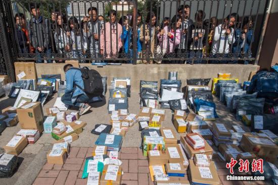 眾多學(xué)生隔著柵欄排隊(duì)等候收取快遞(資料圖)。武俊杰 攝