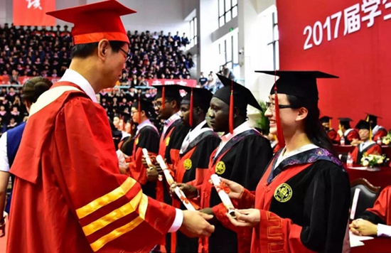 6月14日,西北師范大學(xué)2017屆學(xué)生畢業(yè)典禮舉行。校長(zhǎng)劉仲奎為每一位畢業(yè)生撥穗正冠,并合影留念。李亞妮/攝