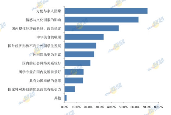 回國發(fā)展原因調(diào)查顯示,“方便與家人團(tuán)聚”和“情感與文化因素的影響”是兩大主因,分別占比70.6%和63%。這與調(diào)查樣本中70.8%的海歸是獨生子女這一事實不無關(guān)系。國內(nèi)經(jīng)濟增長,政治穩(wěn)定;飲食文化、國外經(jīng)濟形勢不利于外國學(xué)生發(fā)展、國內(nèi)休閑娛樂更為豐富等方面因素比例均超過25%。另外,國內(nèi)社會網(wǎng)絡(luò)關(guān)系、所學(xué)專業(yè)在國內(nèi)發(fā)展前景、奉獻(xiàn)精神等亦是重要原因,分別占22%、16.2%、15.8%。因國家相關(guān)優(yōu)惠政策而歸國的人員僅占8.8%。