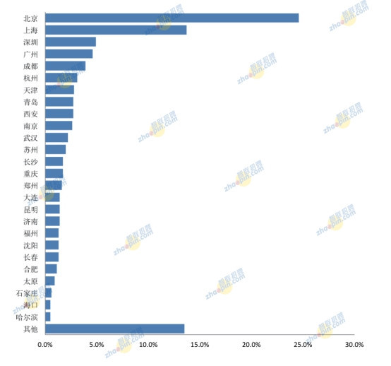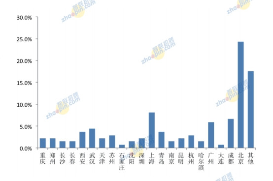 從海歸出生地來看,北京穩(wěn)居首位,且比例遠(yuǎn)遠(yuǎn)超過其它地方。上海、鄭州、廣州、西安、成都居前六位。其它各城市占比依次遞減,但差距微小,且地域涵蓋我國東、中、西各地區(qū)。