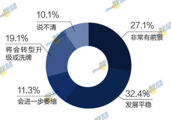 在對目前單位所在行業(yè)未來十年發(fā)展前景的看法上,海歸群體整理持樂觀態(tài)度,認(rèn)為非常有前景的占27.1%,發(fā)展平穩(wěn)的占32.4%,將會轉(zhuǎn)型升級或洗牌的占19.1%,認(rèn)為會進(jìn)一步萎縮的占11.3%,另有10.1%認(rèn)為說不清。