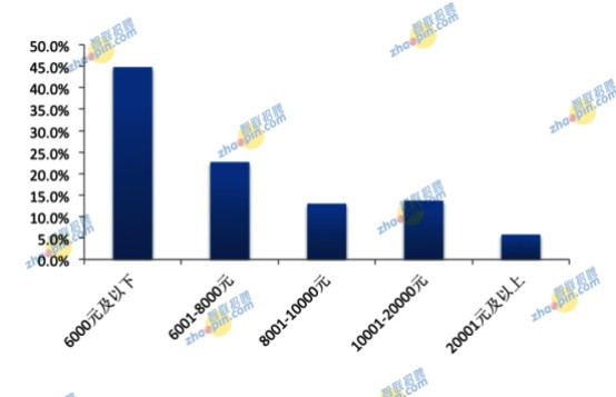 本次調(diào)研中發(fā)現(xiàn),海歸初次就業(yè)的工資分布中,6000元及以下的占比最大,為44.8%,6001-8000元的占比22.7%,8000-10000元、10001-20000元的分別占比13.0%和13.7%。20001元及以上的占比僅為5.8%。