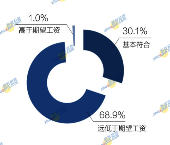 當(dāng)被問及實際工作收入與個人期望是否一致時,認(rèn)為高于期望的僅為1%,認(rèn)為基本符合的占比30.1%,認(rèn)為遠(yuǎn)低于期望工資的占比68.9%。