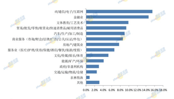 在就職行業(yè)方面,位居前五名的依次為IT/通信/電子/互聯(lián)網(wǎng)、金融業(yè)、文體教育/工藝美術(shù)、貿(mào)易/批發(fā)/零售/租賃業(yè)/快速消費品/耐用消費品、汽車/生產(chǎn)/加工/制造,占比分別為15.5%、14.6%、9.9%、9.4%、9%。此外,能源/礦產(chǎn)/環(huán)保、政府/非盈利機構(gòu)、交通/運輸/物流/倉儲、農(nóng)林牧漁四個行業(yè),占比均在5%以下。