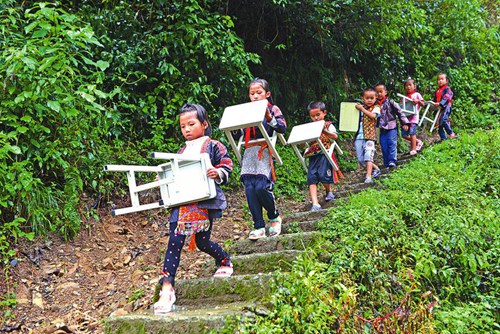 9月5日,久甲小學(xué)的學(xué)生在搬運(yùn)愛(ài)心單位送來(lái)的新課桌凳。