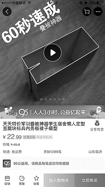 有商家告訴北青報記者,攤開軍訓(xùn)時用的被子,然后將疊被板放在被子中間,“按照步驟,將被子包裹著疊被板折起來,就能成‘豆腐塊’的形狀,整個過程不超過60秒”。一家月銷量為918筆的商家表示,“這款疊被神器不需要將板子拿出來,用起來很方便,都是軍訓(xùn)的學(xué)生來買。”另一月銷量為1299筆的商家也對北青報記者表示,這款產(chǎn)品的購買者大部分都是正在軍訓(xùn)的新生。