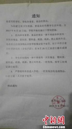 該校在通知內(nèi)容中要求,學(xué)生在校園內(nèi)一律不得使用一次性餐盒、塑料袋、塑料盒、紙袋、紙杯,并禁止叫外賣,一經(jīng)發(fā)現(xiàn),按學(xué)工處規(guī)定進(jìn)行處罰。同時(shí),也嚴(yán)禁校外外賣進(jìn)入學(xué)校,一經(jīng)發(fā)現(xiàn)沒收違規(guī)物品、扣留交通工具并給予處罰。