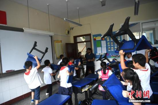 資料圖:9月25日,重慶南岸區(qū)天臺崗小學花園校區(qū)內(nèi)舉行反恐防暴演練。圖為小學生們正在練習如何用身邊工具來保護自己。中新社記者 陳超 攝
