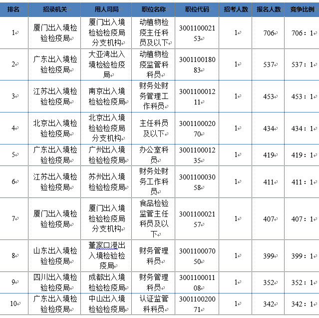 最受考生歡迎的出入境相關崗位,絕大多數(shù)都位于江浙閩粵京魯?shù)劝l(fā)達地區(qū),雖然已經(jīng)表現(xiàn)出很大的競爭趨勢,但報名人數(shù)一漲再漲。截止到11月5日16:00,廈門出入境檢驗檢疫局分支機構(gòu)動植物檢疫主任科員及以下崗位持續(xù)領跑,成為出入境各部門報名人數(shù)最多、競爭比例最高“雙高”職位,競爭比例攀升至達706:1。大亞灣出入境檢驗檢疫局動植物檢疫監(jiān)管科科員崗位緊跟其后,競爭比例達到537:1。競爭比超過400:1的崗位已經(jīng)達到了7個。具體數(shù)據(jù)可參見表1。