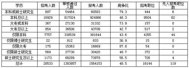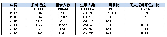 再次從無人報考職位來看,共有119個職位無人報考,占0.74%,比去年降低了一半。而從近7年的數(shù)據(jù)來看,除了2012年為0.7%,其余年份都比今年高,也可以看出考生報名更加向著均衡化發(fā)展。