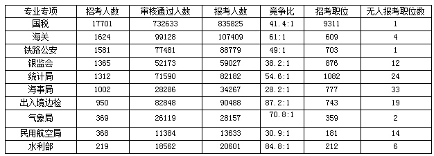 國稅是招錄大戶,共有73萬人通過審核,仍有10萬人待審中,無人報考職位僅剩1個。海關(guān)審核通過人數(shù)位居第二,有9.9萬人通過審核,競爭比為61:1。水利部競爭比最高,為85:1。國稅、海關(guān)、鐵路公安、銀監(jiān)會、統(tǒng)計局、海事局、出入境邊檢、氣象局、民航、水利部是國考招錄大戶,也是考生報考的重點,競爭壓力都不小