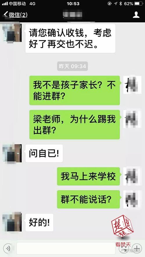 楚天都市報(bào)記者在楊先生提供的視頻中看到,他反映情況后,該校一負(fù)責(zé)人說去找梁老師了解一下情況。幾分鐘后,該負(fù)責(zé)人回來后問楊先生:“你還沒認(rèn)識(shí)你錯(cuò)在哪里?”楊先生問他:“你們踢我出群就是我錯(cuò)了嗎?”“對(duì)!”該負(fù)責(zé)人說。 “家長(zhǎng)群是不是什么人都能進(jìn)?”楊先生反問。