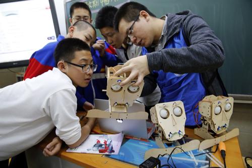 學(xué)生們進(jìn)行“變臉機(jī)器人”科學(xué)實(shí)驗(yàn) 周良 攝