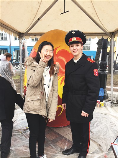 在俄羅斯的節(jié)日慶典活動中,姜若晨(左一)與當?shù)剀娦W生的合影。在她看來,學子與外國朋友的交往過程中要注重自身形象,傳遞中國微笑。