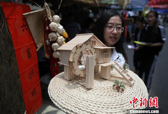 大學(xué)生展示用冰棍桿制成的水車模型!°蟛 攝