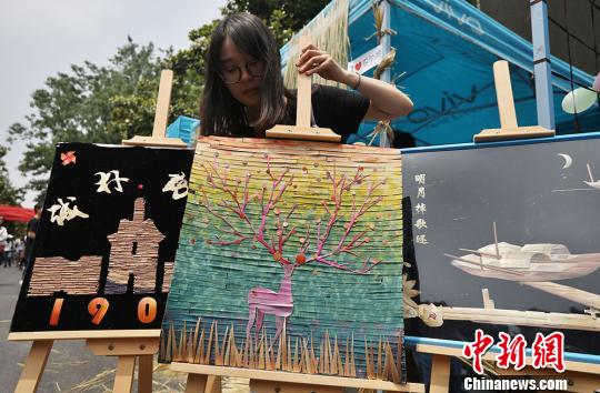 大學(xué)生展示以植物為材料制成的作品!°蟛 攝