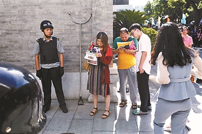 據(jù)了解,這位考生在進考場前發(fā)現(xiàn)自己忘帶準(zhǔn)考證了,正不知所措。在老師指點下,該考生在跟學(xué)校說明情況之后,拿著家長給其傳來的準(zhǔn)考證照片,與考點進行信息核對且得到領(lǐng)隊老師證明之后,順利進入了考場。8點40分,這位考生家長將考生準(zhǔn)考證送至考點外,保安人員隨后將準(zhǔn)考證送進了考場。攝影/本報記者 郝羿
