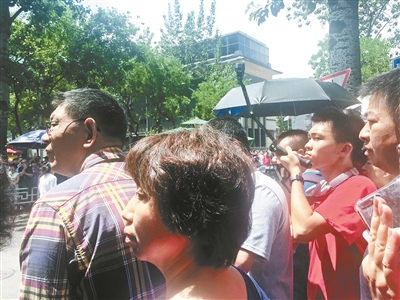 八一學(xué)校的陪考團同樣不甘示弱。昨天下午數(shù)學(xué)科目開考前,人大附中陪考團剛收完橫幅,一位身著八一學(xué)校校服的高大男生,搖著一面巨大的印有“北京市八一學(xué)!钡男F,奮力為自己學(xué)校的考生“應(yīng)援”。